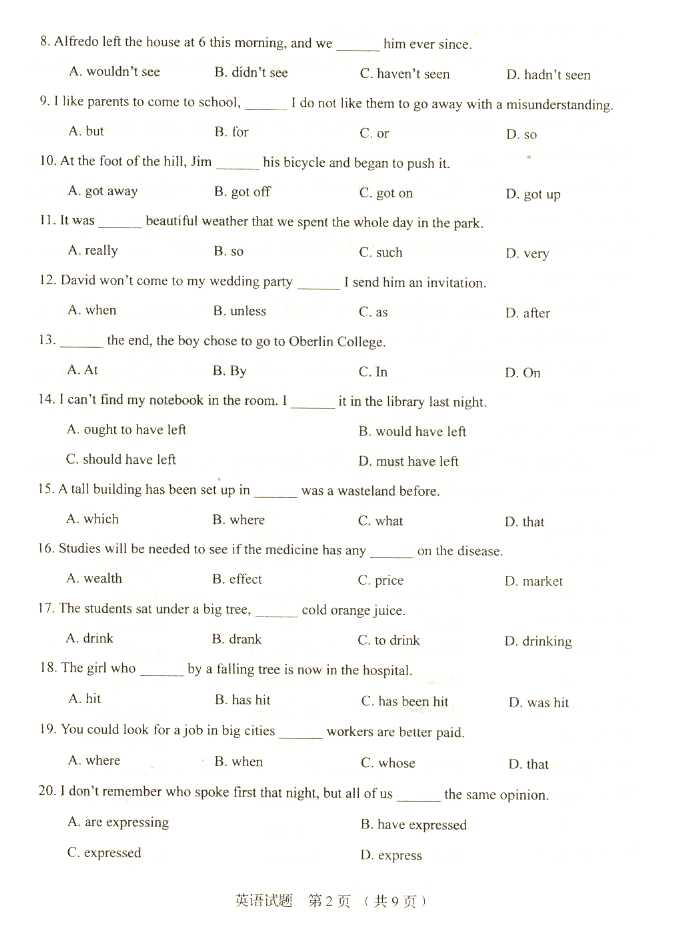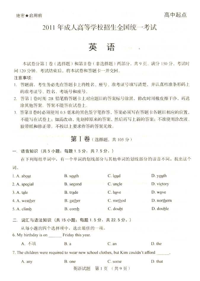 2011年全国成人高考高起点《英语》试题及答案